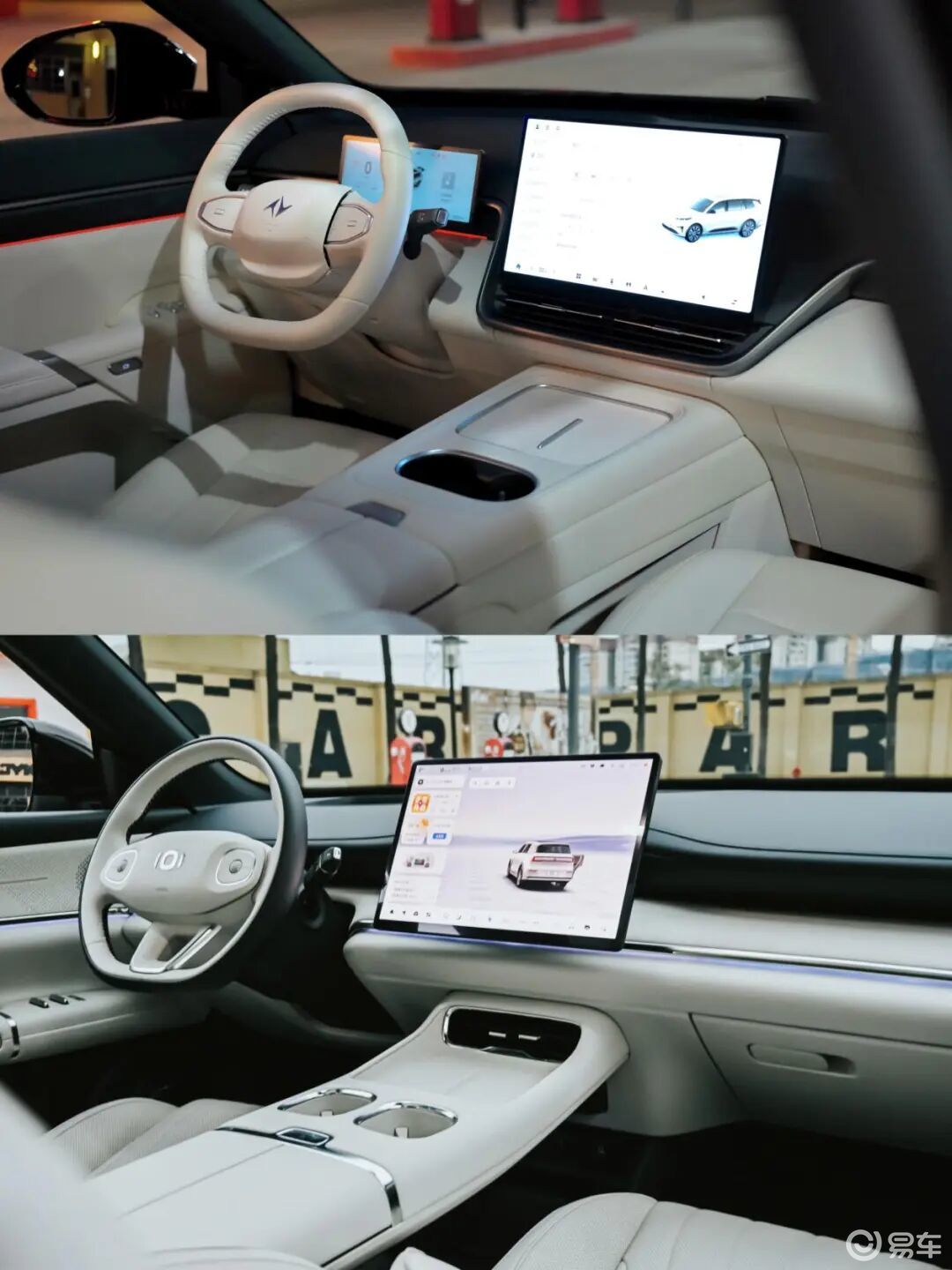 转向手感方面,虽然都是几乎没有路感的电子味儿,但两台车给到了完全不同的手感。eπ008回正力矩大,中心感强,方向盘手感无论是高速还是山路上,都能感受到中大型SUV的分量感,属于不会犯错的稳定发挥。而且启源Q07整体手感更轻盈,中心回正力矩也不够,但转向比偏运动,转动方向盘的圈数更少。