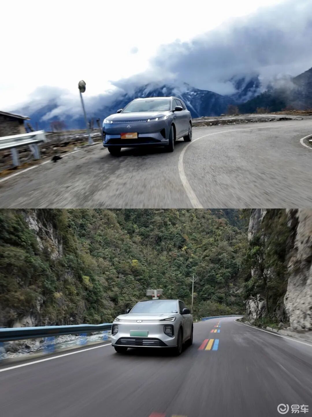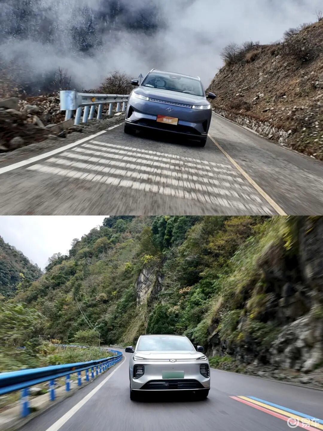 总体来看,后驱的eπ008在山路上有更好的牵引力表现,而且纯电机的响应基本没受到高海拔的影响,只要电量不低于17%的SOC值。甚至在运动模式下,爬坡的扭矩响应会更快。而插混的启源Q07只要不深踩就是P3电机驱动的效果,除非切换至燃油优先并开启运动模式,效果会有所改善。