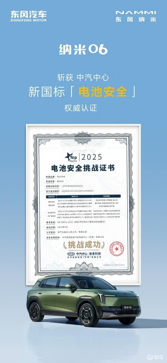 三电品质与安全:央企背书 vs 成熟体系东风纳米06背靠东风集团 “量子架构” 和 “马赫E动力平台”。电池包采用航空级6系铝合金框架,Pack防护号称达到军用级别。通过了远超国标的 300J底部撞击测试和双针刺安全挑战。获得中汽研“能效之星”认证,电驱效率高。提供终身免费电池/电控/电驱/整车质保及道路救援(限首任非营运车主),彰显对品质的信心。全车37处隔音设计,NVH表现出色。