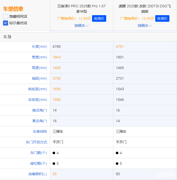 此前,自主品牌高性能豪华家轿新标杆——艾瑞泽8 PRO已强势来袭,向以大众速腾为代表的合资家轿发起强有力大反攻。那么,艾瑞泽8 PRO到底实力如何,能否让“老牌劲旅”黯然失色?让我们以价格相差无几的2025款艾瑞泽8 PRO 1.6T-7DCT豪华型(下称艾瑞泽8 PRO)与2025款速腾200TSI自动飞越版(下称速腾)为例,抢先来一探究竟!