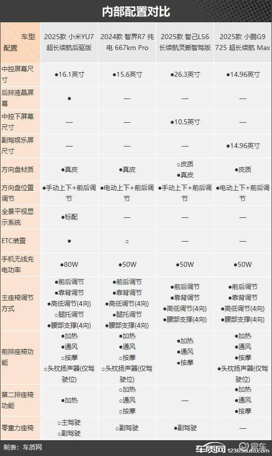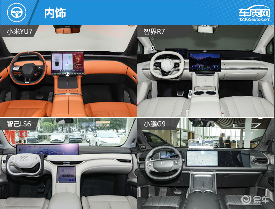 在内部配置方面,小鹏G9在舒适性上表现出色,前后排座椅功能最为丰富,但遗憾的是未配备零重力座椅。相比之下,智己LS6则标配该功能,并且是四款车型中唯一拥有10.5英寸中控下屏幕的车型,中控台布局更显层次感。小米YU7除搭载上文提到的全景平视显示系统外,还独享后排液晶屏幕,并拥有四车中最高的手机无线充电功率,科技体验尤为出众。至于智界R7,虽标准配置相对基础,但可通过选装方式进行补强,满足更高阶的个性化需求。
