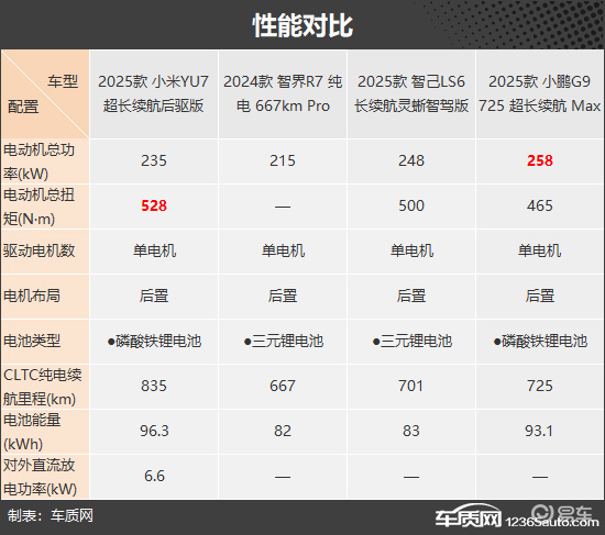 动力方面,四款车型均采用后置单电机布局,其中小鹏G9与小米YU7分别在电动机总功率与总扭矩方面表现出色。小米YU7还凭借电池容量上的优势,获得了四车中最长的CLTC纯电续航里程。同时,其也是唯一支持对外直流放电的车型,实用性更强。尽管智界R7的动力参数相对平淡,但它与智己LS6均搭载成本更高的三元锂电池组,在低温环境下具备更稳定的续航表现,对北方用户更为友好。