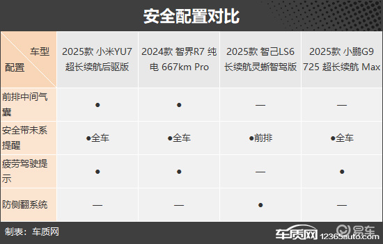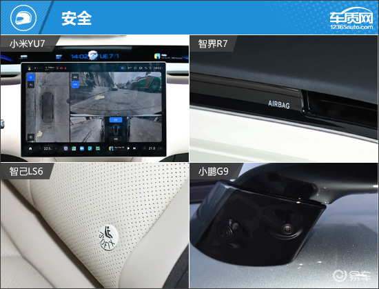 四款车型在安全配置方面整体表现较为均衡,基础防护能力均处于较高水平。其中,小米YU7与智界R7的安全配置最为全面,表现好于另外两款车型。相比之下,智己LS6和小鹏G9表现一般,都没有配备前排中间气囊,被动安全方面略逊一筹。