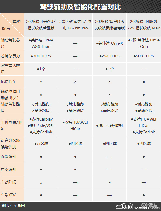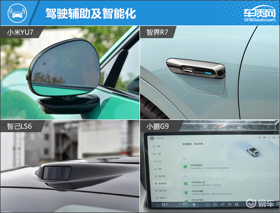 在驾驶辅助硬件方面,小米YU7与智己LS6均配备激光雷达,其中小米YU7更是搭载了当前行业顶尖的英伟达 Drive AGX Thor辅助驾驶芯片,拥有更强算力,硬件水平领先。不过可惜的是,其高阶辅助驾驶功能目前仅支持选装。相比之下,小鹏G9虽然采用纯视觉方案,却标配了最全面的辅助驾驶能力,堪称优秀。