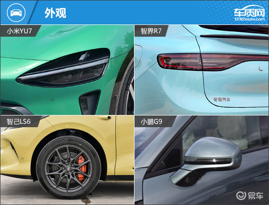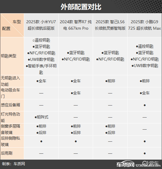 在外部配置方面,四款车型展现出了较为明显的差异。小米YU7依托手机厂商丰富的智能生态,是唯一支持智能手表/手环钥匙的车型,同时矩阵式灯光特色功能也可进一步提升夜间行驶的安全性。智界R7与小鹏G9则均配备电动吸合车门,带来了更为优雅的关门体验。其中,后者还搭载感应式后备厢,在便捷性方面更胜一筹。相比之下,智己LS6的表现略显暗淡,并未有突出之处,还是唯一没有使用后排侧隐私玻璃的车型。