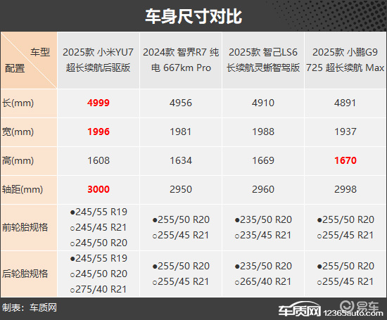 车身尺寸方面,小米YU7表现尤为出色,不仅在长度和宽度上领先,也是唯一轴距突破3000mm的车型。智界R7与智己LS6虽略逊一筹,但得益于合理的车身比例,依然可提供良好的乘坐空间。相比之下,小鹏G9整体尺寸偏小,但轴距方面仍具有竞争力。