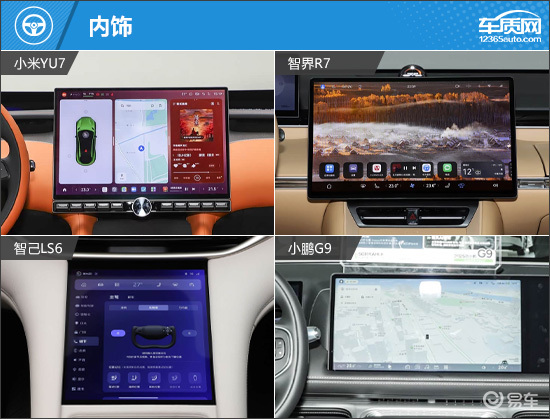 如今的新能源车型在内饰设计上趋于同质化,但本次推荐的四款车型却各有巧思。智己LS6以超大尺寸联屏营造出强烈的未来感,视觉冲击力十足;小米YU7首发的全景平视显示系统颇具新意,它替代了传统液晶仪表,改用风挡下方的超黑区域反射行车信息。小鹏G9和智界R7的设计相对保守,但前者通过副驾娱乐屏为乘客提供了丰富的影音娱乐功能,后者则配备小尺寸椭圆方向盘,兼顾操作便利性与运动氛围。内饰用料方面,四款车型表现一致,均大量采用皮质进行包覆,既保障了出色的触感,也营造出较强的豪华感。