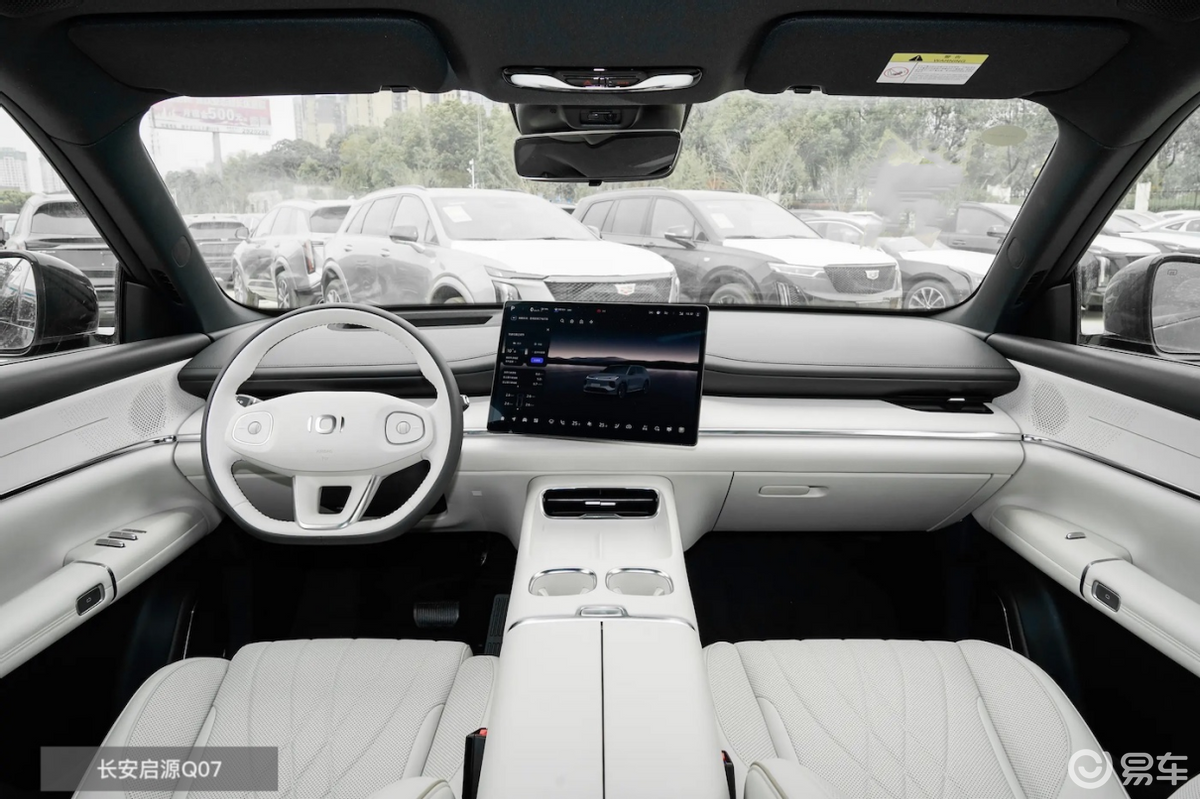 长安启源Q07的天枢座舱则是算力更高的高通骁龙8155芯片,它用49英寸AR-HUD抬头显示取代了传统仪表,并配有15.4英寸触控屏、12.8英寸副驾娱乐屏,前者能根据语音交互偏转角度、后者能收纳进车顶;而后排也能拓展Pad屏、能用语音交互,在娱乐硬件的支持上要丰富些。