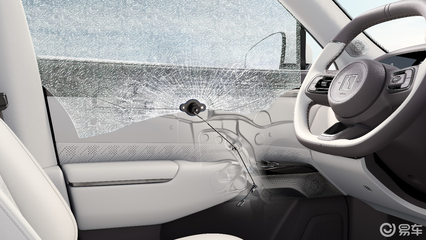 值得一提的是,区别于普通双层夹胶玻璃,焕新极氪7X采用外层3.5mm钢化玻璃+0.76mmPVB胶膜+ 内层1.1mm钢化玻璃的设计,表层压应力和内部张应力形成力学平衡,主驾安全破窗器可以轻松击穿。