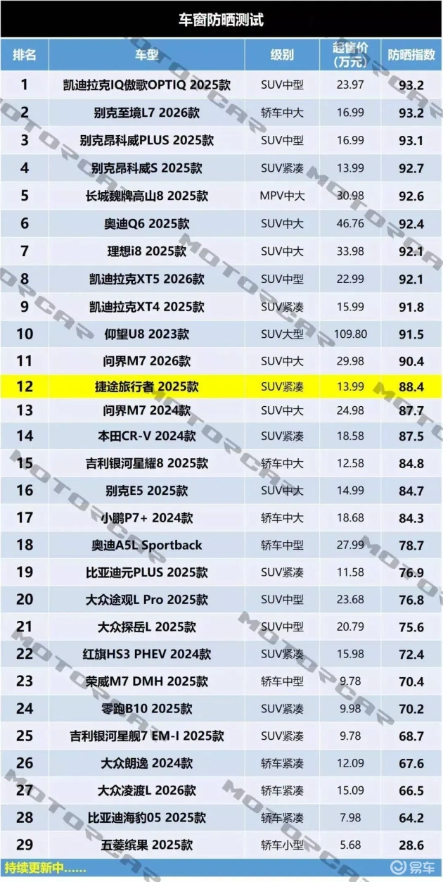 根据测试模型计算,捷途旅行者 2025款的全车防晒指数为88.4分,在目前的测试排名中暂居第12位。在同价位车型中,这一排名表现较为出色。