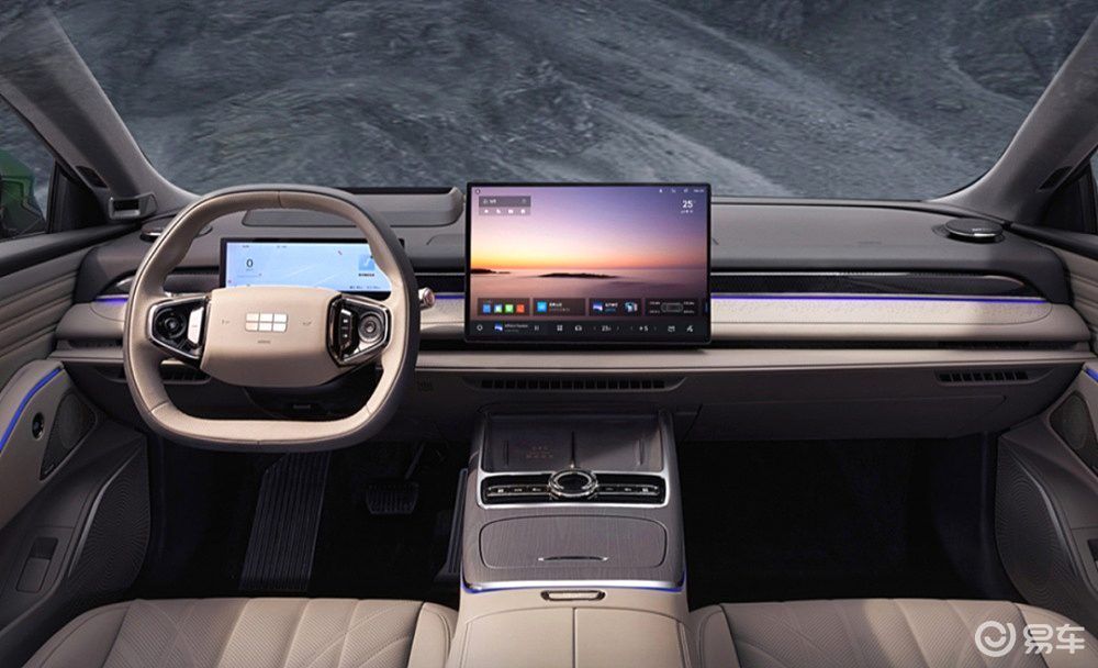 内饰方面,新车提供皓月米与玄武灰两种配色方案,标配8.8英寸全液晶仪表和12.8英寸中控屏,配备皮质平底方向盘并带智驾拨片。