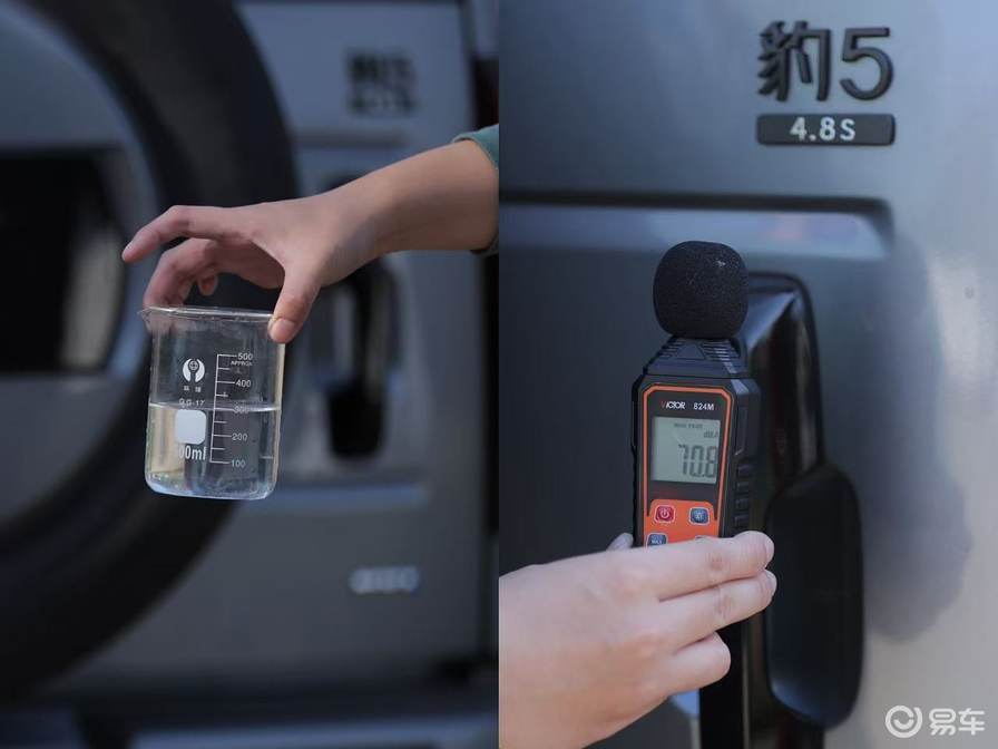 豹5的分时四驱在复杂路况下表现稳定,但前后双叉臂硬派悬挂调校让车内颠簸感明显,水杯剩余水量300ml,分值达70.8dB(类似繁忙街道噪音),最终用时2分04秒,得分7分。