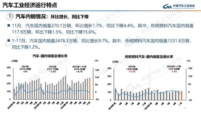 11月,汽车国内销量270.1万辆,环比增长1.7%,同比下降4.4%。其中,传统燃料汽车国内销量117.9万辆,环比下降1.5%,同比下降15.6%。1-11月,汽车国内销量2478.3万辆,同比增长9.7%。其中,传统燃料汽车国内销量1231.8万辆同比下降1.2%。
