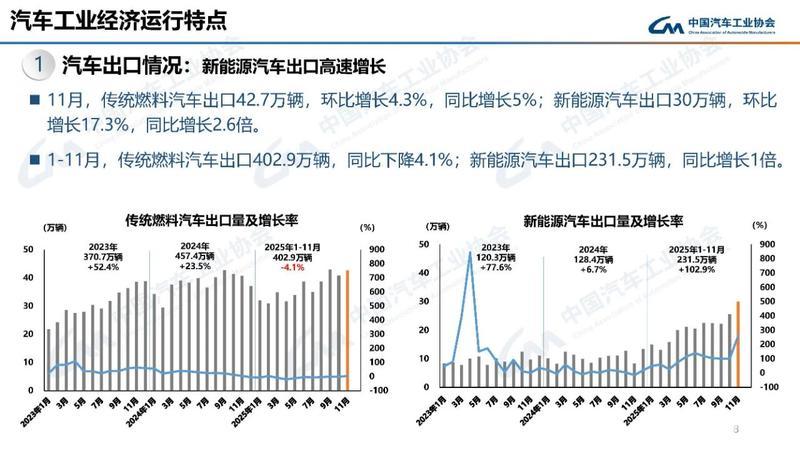 新能源汽车出口高速增长,11月,传统燃料汽车出口42.7万辆,环比增长4.3%,同比增长5%;新能源汽车出口30万辆,环比增长17.3%,同比增长2.6倍。1-11月,传统燃料汽车出口402.9万辆,同比下降4.1%;新能源汽车出口231.5万辆,同比增长1倍。