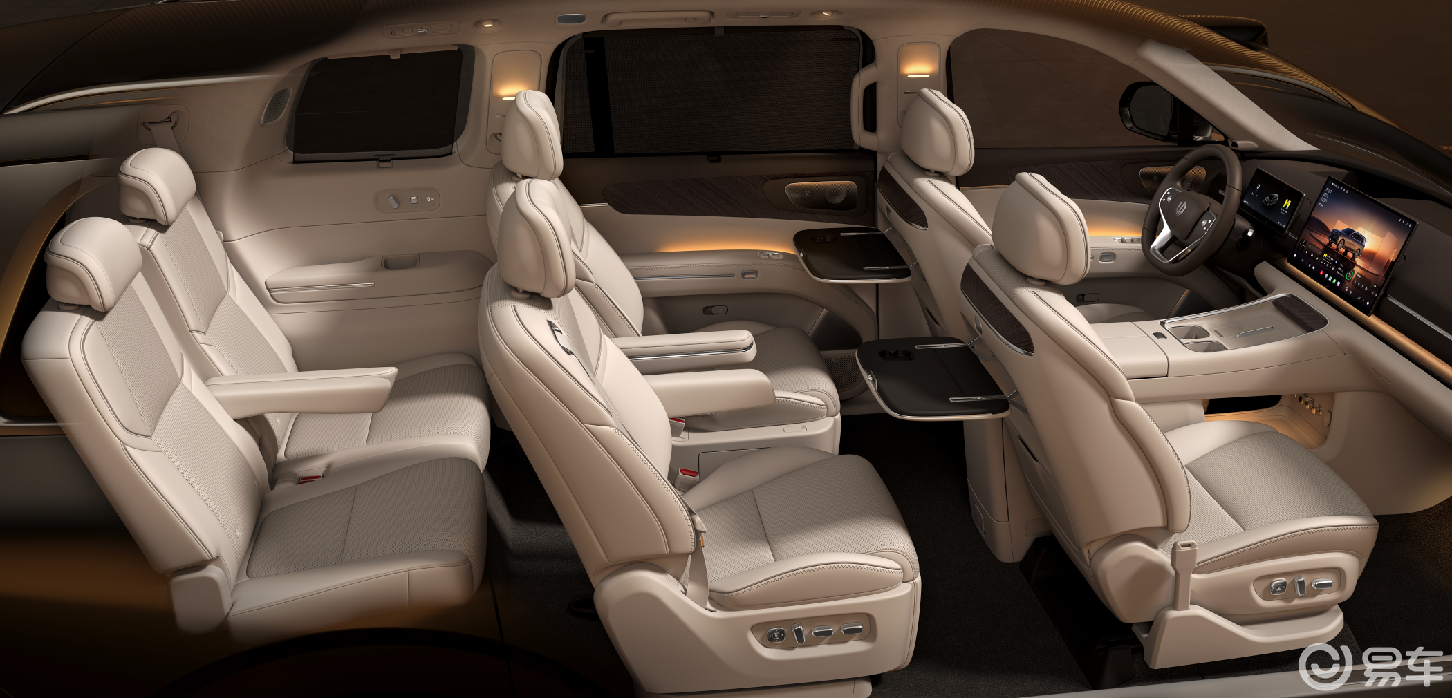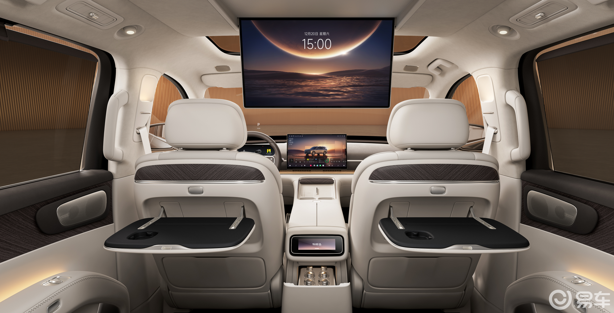 车内可选2+2+2六座、2+3+2七座两种布局,其中六座二排右侧采用120°零重力座椅,七座二排也有可翻折扶手+50W手机无线快充。而21.4英寸3K吸顶娱乐屏、6英寸控制屏、冷暖冰箱、折叠小桌板也都没有缺席,再配合阅读灯/壁灯、香氛、天幕、二三排遮阳帘以及Leap Sound23扬音响等,乘坐舒适性不言而喻。另外第三排座椅还有扶手、靠背调节、加热、一键折叠等功能。