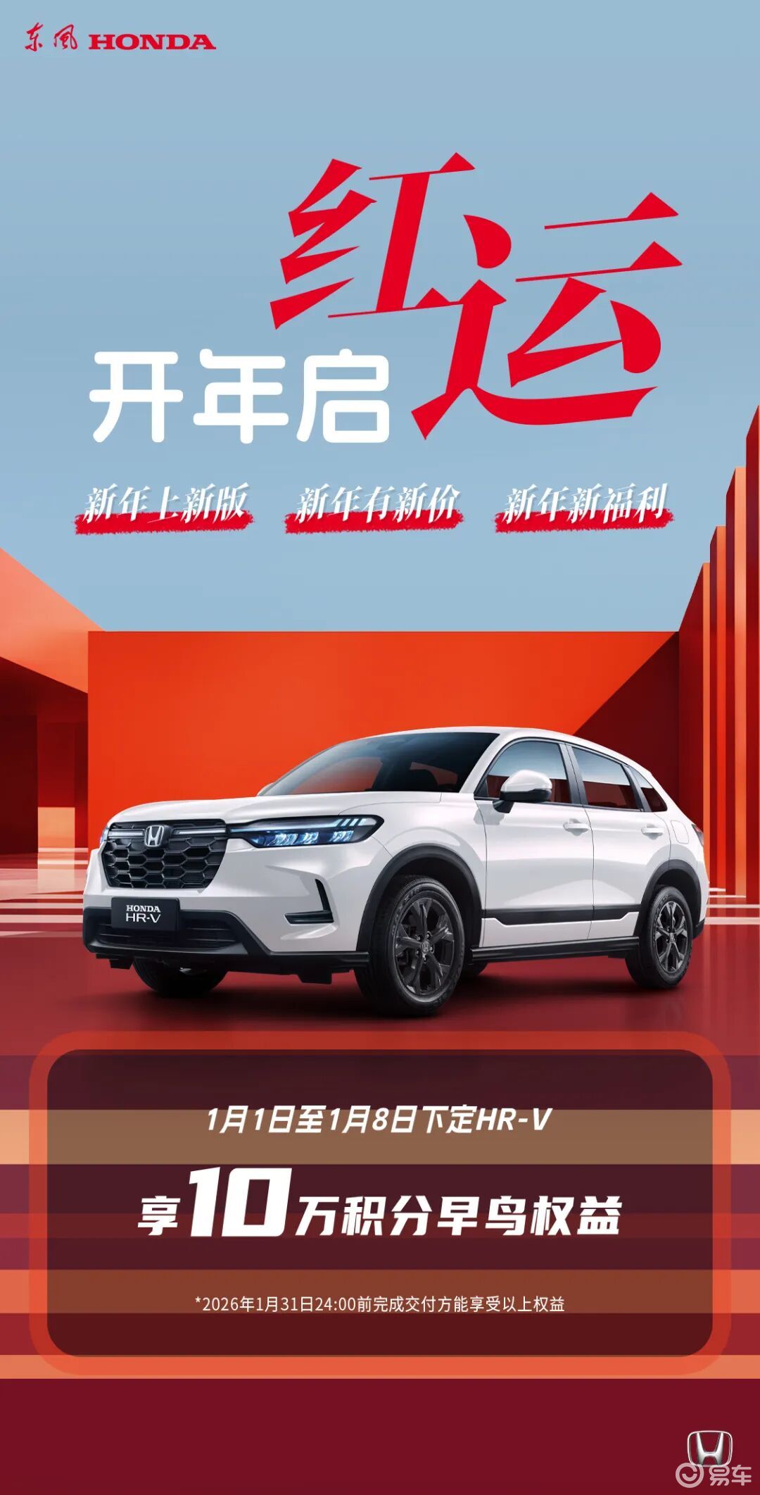 值得一提的是,东风本田官宣HR-V全新版本——Pro版与Max版将于1月8日焕新发布。为回馈消费者的期待,品牌同步推出新年早鸟福利:即日起(2026年1月1日-1月8日)下定HR-V,即可获得东风本田APP商城10万积分专属购车权益,让用户能以最大的回报获得合资品质红利。