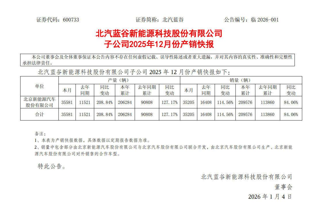北汽蓝谷子公司北京新能源全年销量超20万辆,同比增长84.06%,呈现“低基数高增长”态势。其中,极狐品牌全年销量超16万辆,同比增长99%;享界品牌随着享界S9T的上市,迎来销量增长,过去12月份销量整整1万辆,表现出强增长势头,而是否能持续待观察。公司销量略高于产量,有去库存动作。