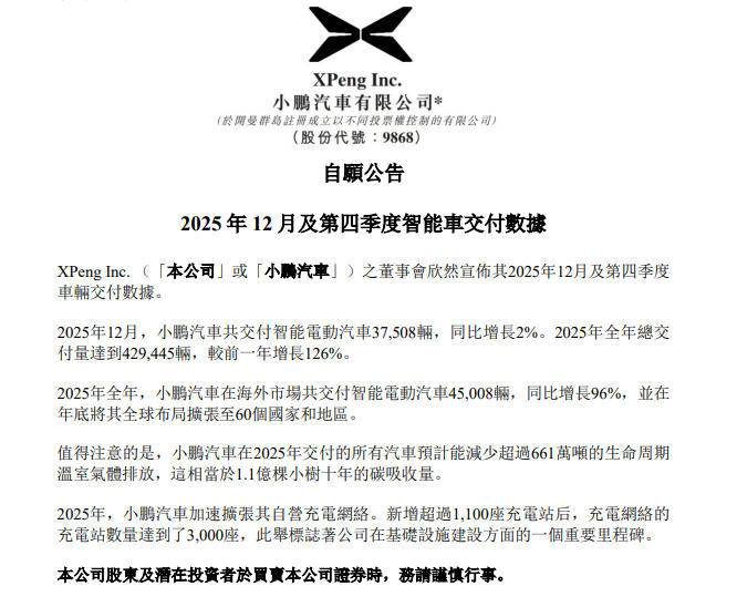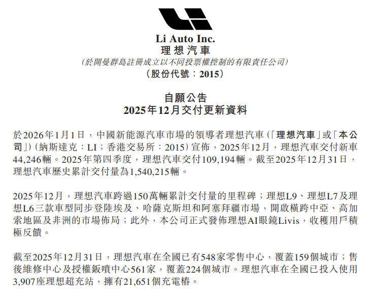 理想汽车在12月份快报中未公布全年交付量与增减情况,结合其已公布的第四季度交付量109,194辆与此前公布的前三季度交付量297,149辆计,理想汽车2025年交付量为406,343辆,同比下滑18.8%。对于理想汽车而言,这是可被预期的,原因是纯电车业务虽增长但不能填补增程车业务受竞争影响带来的下滑。不过,理想汽车累计交付量已突破150万辆,AI眼镜Livis的上市已表明理想汽车正开拓新业务。