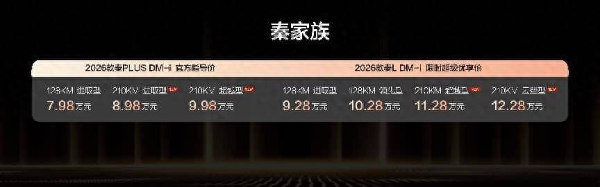 1月8日,比亚迪秦(参数|询价)家族迎来重磅加推,2026款秦L(参数|询价) DM-i /2026款秦PLUS DM-i 210KM长续航版双车同步上市,售价8.98-12.28万元。其中,2026款秦L DM-i 210KM长续航版限时超级优享价11.28-12.28万元,2026款秦PLUS DM-i 210KM长续航版售价8.98-9.98万元。同时,两款车型均带来了丰厚的上市权益礼。