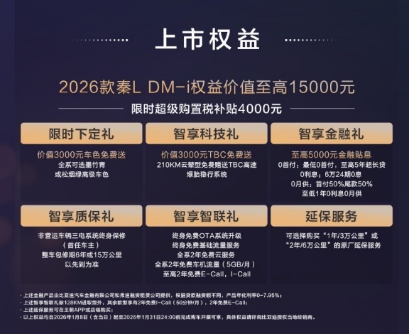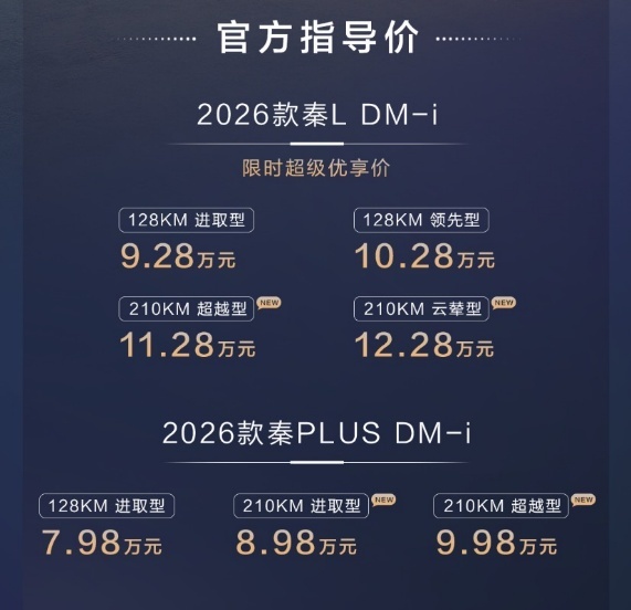 “宋”驰人生 长“秦”相伴,近日,比亚迪双雄“秦DM-i/宋P DM-i”长续航联袂登场,为2026年新能源汽车领域迎来历史性突破,她以突破想象,续航新纪元正式开启2026年的征程,更以搭载比亚迪特有的“云辇-C”带来独有的驾乘体验,宋PLUS DM-i纯电220KM超长续航,油耗低至3.2L,秦PLUS DM-i纯电续航210KM,油耗低至2.7L,为插混A级车SUV级轿车市场带来纯电的自由。
