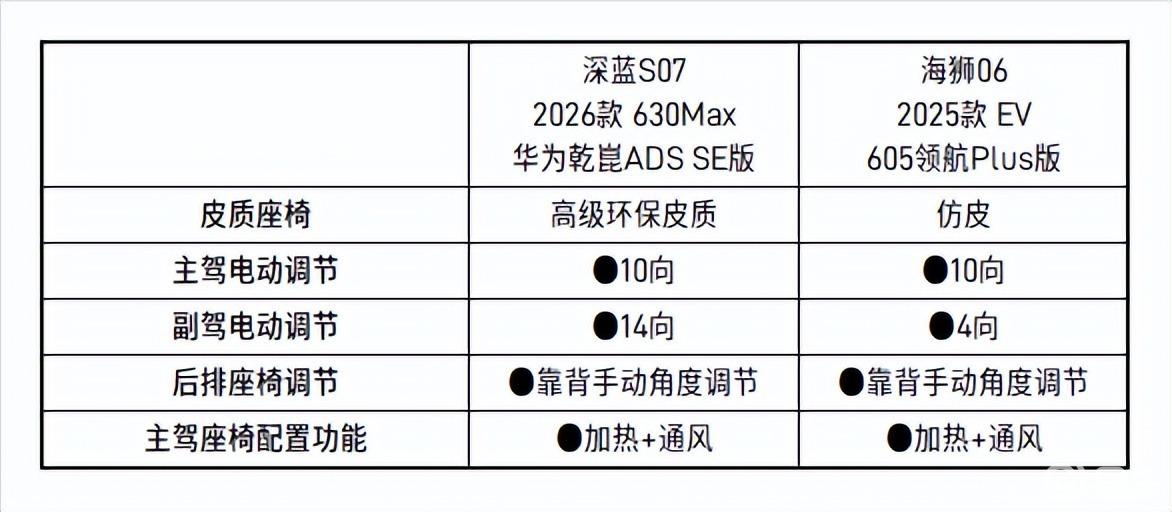 还有座椅用料方面,两款车的主副驾虽然都支持加热、通风功能,不过海狮06 EV的座椅采用的是普通的仿皮,主驾和副驾分别支持10向和4向电动调节;而全新深蓝S07采用的是高级环保皮质,主驾和副驾分别支持10向和14向电动调节,功能更丰富,不管什么样的体型都能拥有良好的乘坐体验,而且顶配还提供副驾零重力按摩座椅,明显做得更加人性化。