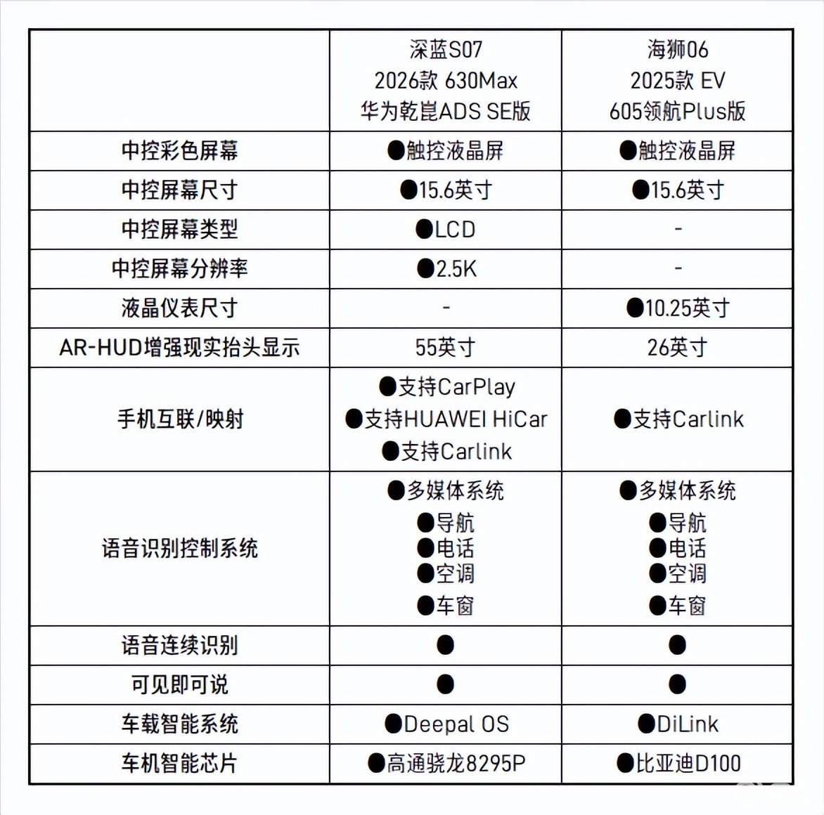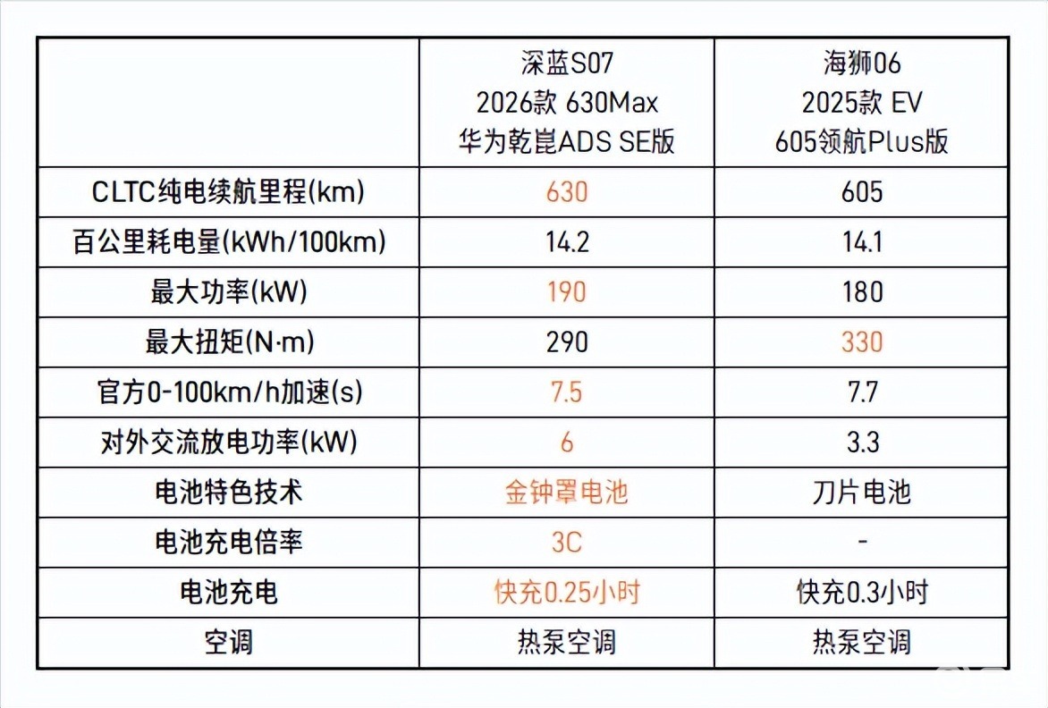 为了对比客观公平,我选择终端落地价相近版本进行对比,让大家根据自己的实际用车需求作决策。全新深蓝S07选择的是2026款630Max 华为乾崑ADS SE版,指导价16.49万元;海狮06 EV选择的是605领航PLUS版(顶配),指导价16.38万元。