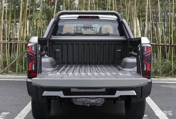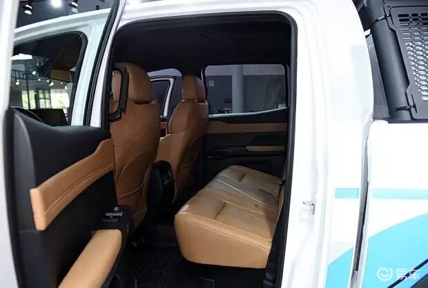 进入车内,该车虽为皮卡定位,但内饰设计注重科技感与舒适性。车内配备三辐式多功能方向盘,并提供15.6英寸与12.3英寸两种尺寸的悬浮式中控屏可选。整体采用浅棕色与黑色双色搭配,并在多处细节融入镀铬装饰。高配车型还搭载了包含ACC自适应巡航、车道保持辅助及自动紧急刹车等功能的驾驶辅助系统。